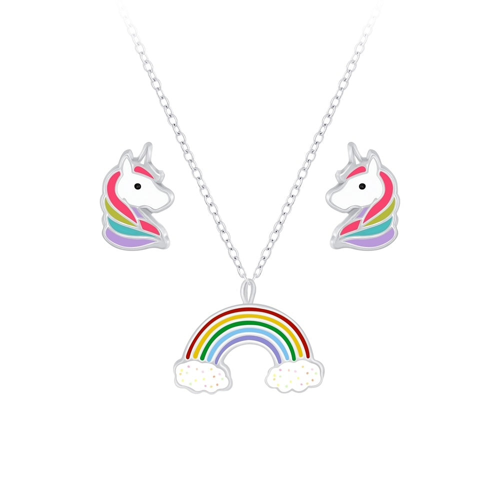 Sterling Silver Rainbow Necklace and Unicorn Ear Studs Set